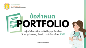 - ข้อกำหนด Portfolio หลักสูตรแพทยศาสตรบัณฑิต สำหรับผู้สมัครโครงการผลิตแพทย์เพื่อชาวชนบท กลุ่มสำเร็จการศึกษาระดับปริญญาตรีลาเรียน (Strengthening Track) ประจำปีการศึกษา 2568