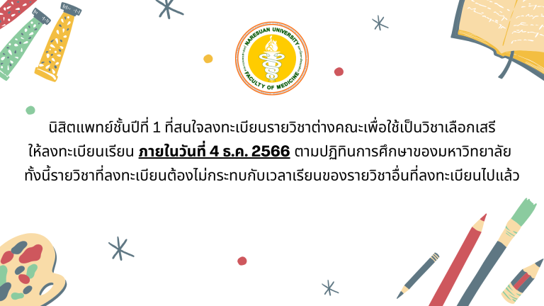 ข่าวสาร นิสิตแพทย์ชั้นปีที่ 1 ที่สนใจลงทะเบียนรายวิชาต่างคณะเพื่อใช้เป็นวิชาเลือกเสรีดำเนินการลงทะเบียนเรียน ภายในวันที่ 4 ธ.ค. 256630/11/202330/11/2023