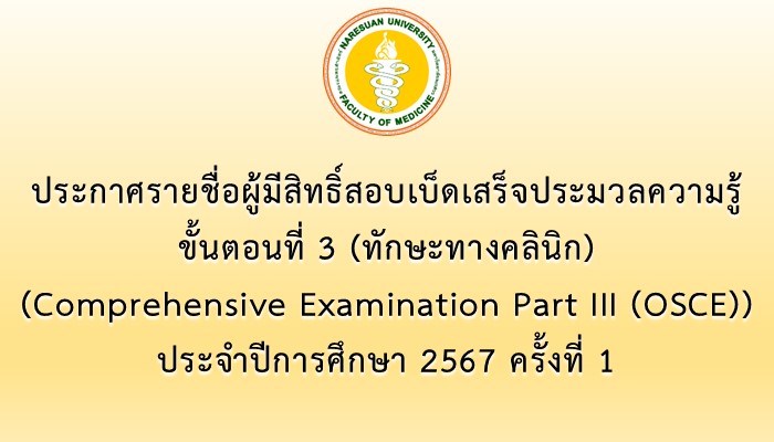 สมัครสอบ/ตรวจผลสอบ ประกาศผลการสอบเบ็ดเสร็จประมวลความรู้ ขั้นตอนที่ 3 (Comprehensive Examination Part III (OSCE)) ประจำปีการศึกษา 2567 ครั้งที่ 117/01/2025
