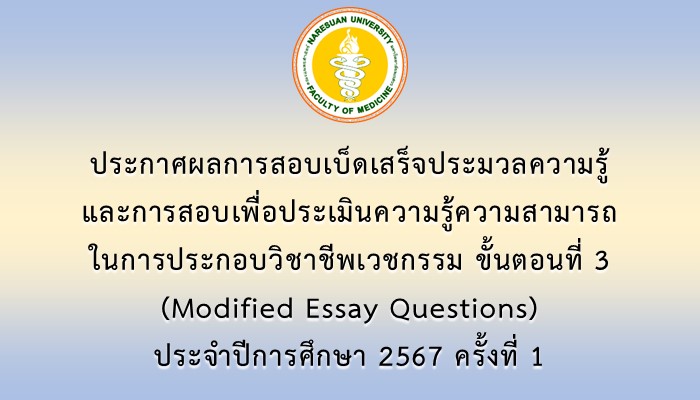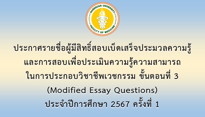 สมัครสอบ/ตรวจผลสอบ ประกาศรายชื่อผู้มีสิทธิ์สอบเบ็ดเสร็จประมวลความรู้และการสอบเพื่อประเมินความรู้ความสามารถในการประกอบวิชาชีพเวชกรรม ขั้นตอนที่ 3 (Modified Essay Questions) ประจำปีการศึกษา 2567 ครั้งที่ 106/01/202506/01/2025