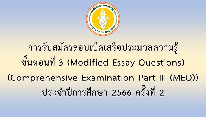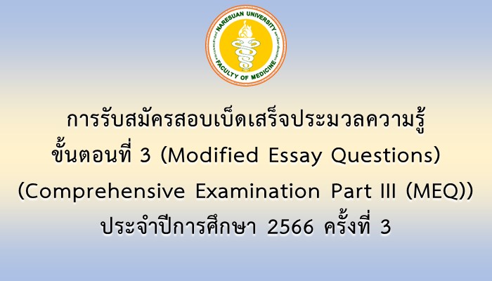 สมัครสอบ/ตรวจผลสอบ ประกาศผลการสอบเบ็ดเสร็จประมวลความรู้ ขั้นตอนที่ 3 (Modified Essay Questions) (Comprehensive Examination Part III (MEQ)) ประจำปีการศึกษา 2566 ครั้งที่ 201/03/202401/03/2024