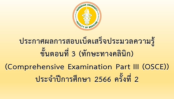 สมัครสอบ/ตรวจผลสอบ ประกาศผลการสอบเบ็ดเสร็จประมวลความรู้ ขั้นตอนที่ 3 (Comprehensive Examination Part III (OSCE)) ประจำปีการศึกษา 2566 ครั้งที่ 214/02/202414/02/2024