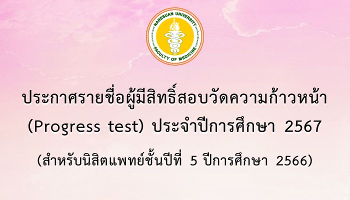 สมัครสอบ/ตรวจผลสอบ ประกาศรายชื่อผู้มีสิทธิ์สอบวัดความก้าวหน้า (Progress test) ประจำปีการศึกษา 2567 (สำหรับนิสิตแพทย์ชั้นปีที่ 5 ปีการศึกษา 2566)21/03/202421/03/2024