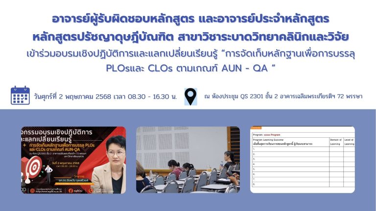 ประกันคุณภาพการศึกษา อาจารย์ผู้รับผิดชอบหลักสูตร และอาจารย์ประจำหลักสูตรปรัชญาดุษฎีบัณฑิต สาขาวิชาระบาดวิทยาคลินิกและวิจัย เข้าร่วมอบรมเชิงปฏิบัติการและแลกเปลี่ยนเรียนรู้ “การจัดเก็บหลักฐานเพื่อการบรรลุ PLOsและ CLOs ตามเกณฑ์ AUN – QA ”08/05/202520/06/2025