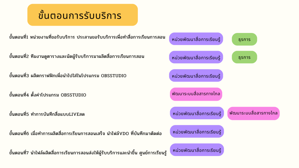 ในการให้บริการผลิตสื่อการเรียนการสอน รับผิดชอบโดยหน่วยผลิตสื่อการเรียนรู้ ซึ่งในปัจจุบันมีการรับงานสื่อการสอนสัดส่วนที่เพิ่มขึ้น และเพื่อให้สอดคล้องกับยุทธศาสตร์ฝ่ายวิชาการ World class education การพัฒนาเทคโนโลยีด้านการศึกษาและทักษะที่จำเป็นสำหรับคนในศตวรรษที่ 21 ทั้งนี้ ด้วยกระบวนการตัดต่อการทำสื่อวิดีโอ ใช้ระยะเวลาค่อนข้างมาก ทางทีมงานโสตทัศนูปกรณ์และเทคโนโลยีการศึกษา จึงได้เรียนรู้และประยุกต์โปรแกรมที่เหมาะสม โดยเลือกใช้ OBS Studio มาปรับใช้คู่กับเครื่องมืออุปกรณ์ในห้อง Studio Station เพื่อลดเวลาในการผลิตสื่อและมุ่งเน้นให้ผู้รับบริการสามารถใช้งานได้สะดวกยิ่งขึ้น