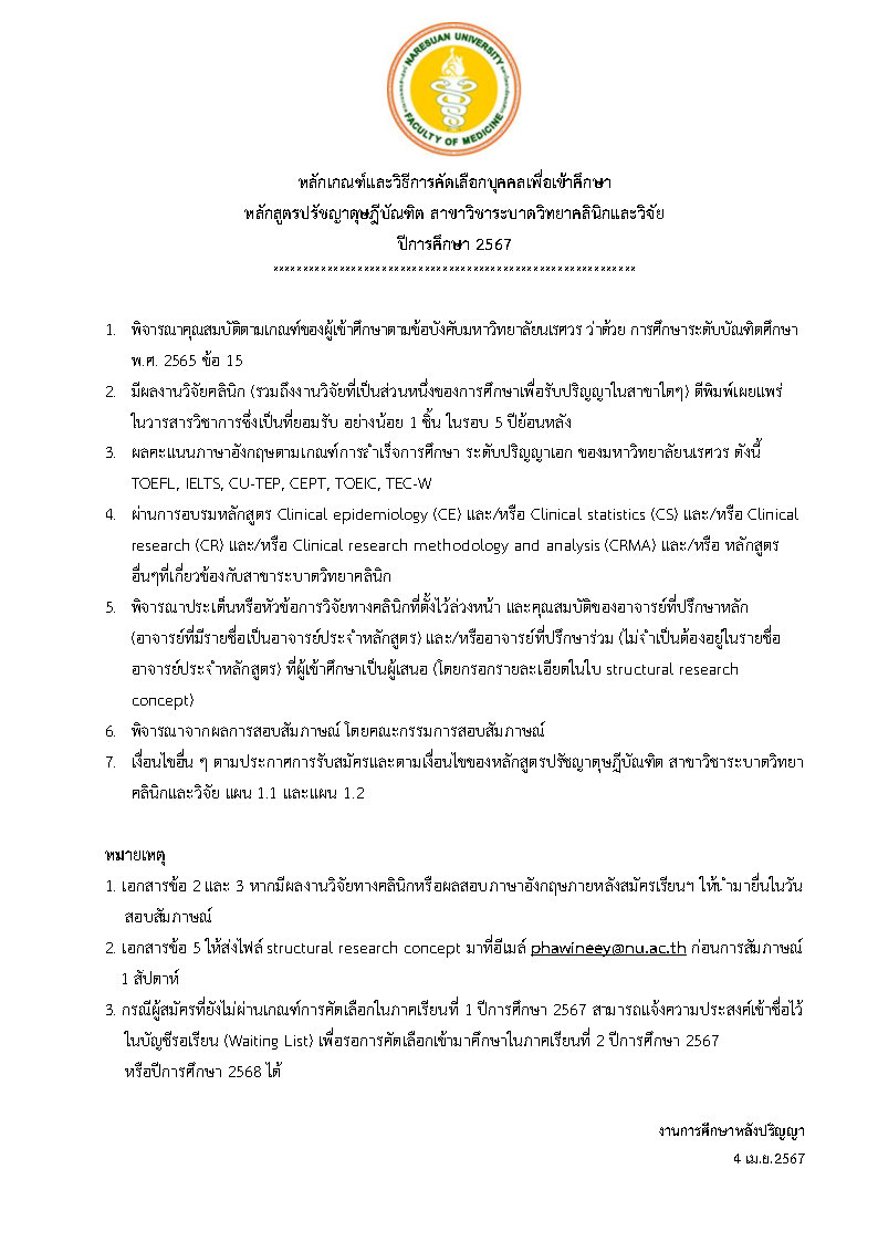 หลักสูตรปรัชญาดุษฎีบัณฑิต สาขาวิชาระบาดวิทยาคลินิกและวิจัยปีการศึกษา 2567