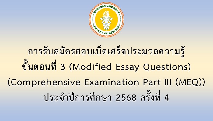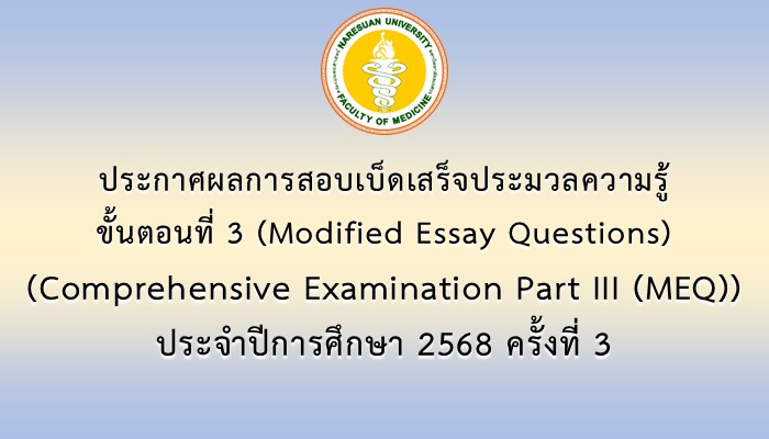 สมัครสอบ/ตรวจผลสอบ ประกาศผลการสอบเบ็ดเสร็จประมวลความรู้ ขั้นตอนที่ 3 (Modified Essay Questions) (Comprehensive Examination Part III (MEQ)) ประจำปีการศึกษา 2568 ครั้งที่ 3March 20, 2026March 20, 2026