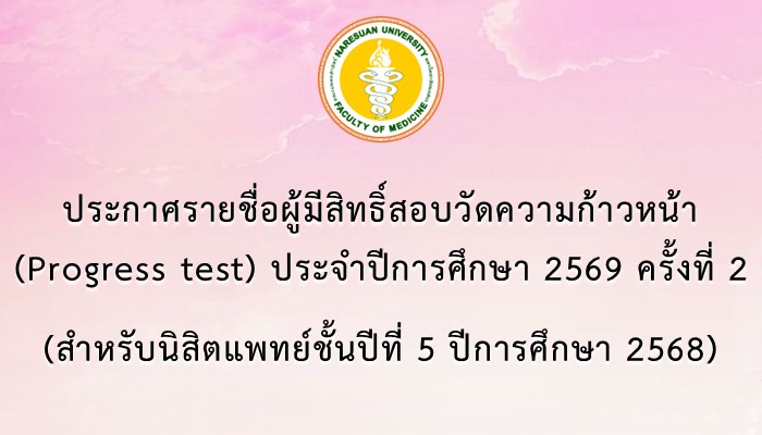 สมัครสอบ/ตรวจผลสอบ ประกาศรายชื่อผู้มีสิทธิ์สอบวัดความก้าวหน้า (Progress test) ประจำปีการศึกษา 2569 ครั้งที่ 2 (สำหรับนิสิตแพทย์ชั้นปีที่ 5 ปีการศึกษา 2568)March 20, 2026March 20, 2026